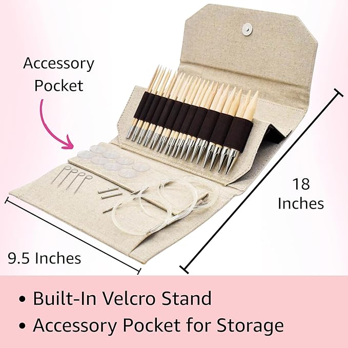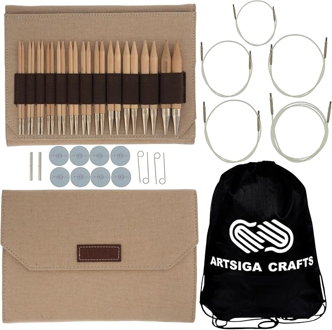 - Includes 1 Lykke Naturale 5 Inch (13cm) Interchangeable Circular Knitting Needles Birch Wood US Sizes 4, 5, 6, 7, 8, 9, 10, 10.5, 11, 13, 15, & 17 with 5 cords, connectors, Beige Jute Canvas Case and 1 Project Bag