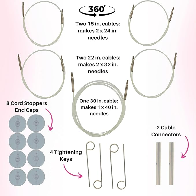 - Lykke set includes 12 pairs knitting needles 5" long US 4, 5, 6, 7, 8, 9, 10, 10.5, 11, 13, 15, 17 (Metric: 3.5, 3.75, 4, 4.5, 5, 5.5, 6, 6.5, 8, 9, 10, 12mm); 5 cords 2 x 24" (60cm), 2 x of 32" (80cm) and 1 x 40" (100cm); 2 connectors, 4 keys and 8 stoppers