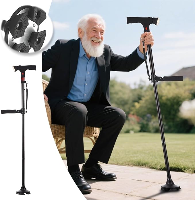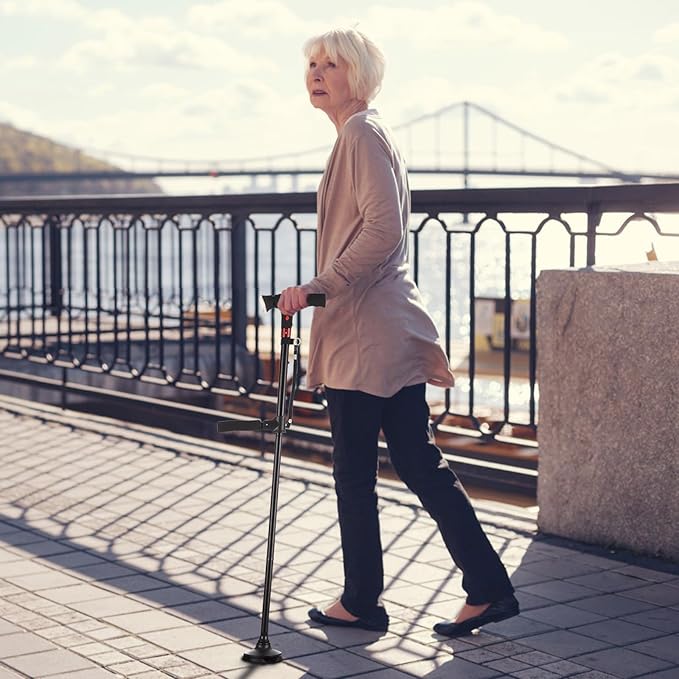 - 【All-Terrain Stability Base】The pivoting quad cane design with 4-pronged non-slip base delivers superior traction on all surfaces. Featuring 360-degree rotating tips and self-standing capability, this stability cane provides reliable terrain adaptation and convenient upright resting without wall support.