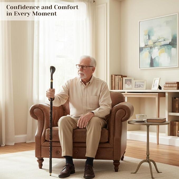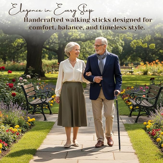 - Carved black wooden shaft provides durability, stability, and fine artisan texture for smooth walking.