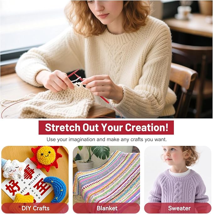- [ High - Grade & Wide Application ]: Made of high-grade aluminum, come with no seams or chips that is smoother for you to move in and out of the yarn, preventing snagging. Also, these adjustable circluar knitting needles crafted with 4 super flexible and strong cables ( length: 12.6" 15" 16.7" 21.7"), you can combine any size and length freely and make kinds of crafts.